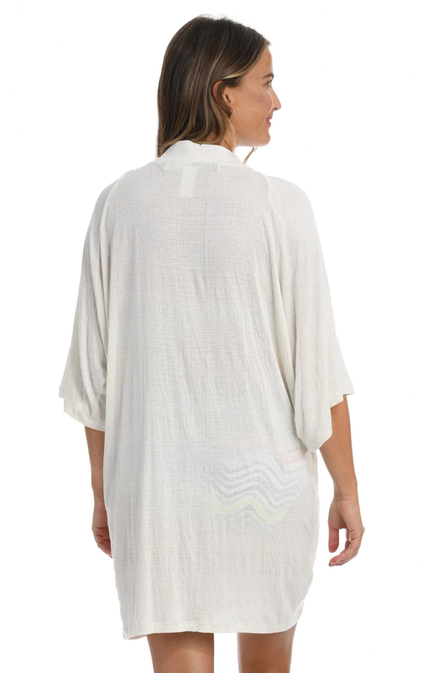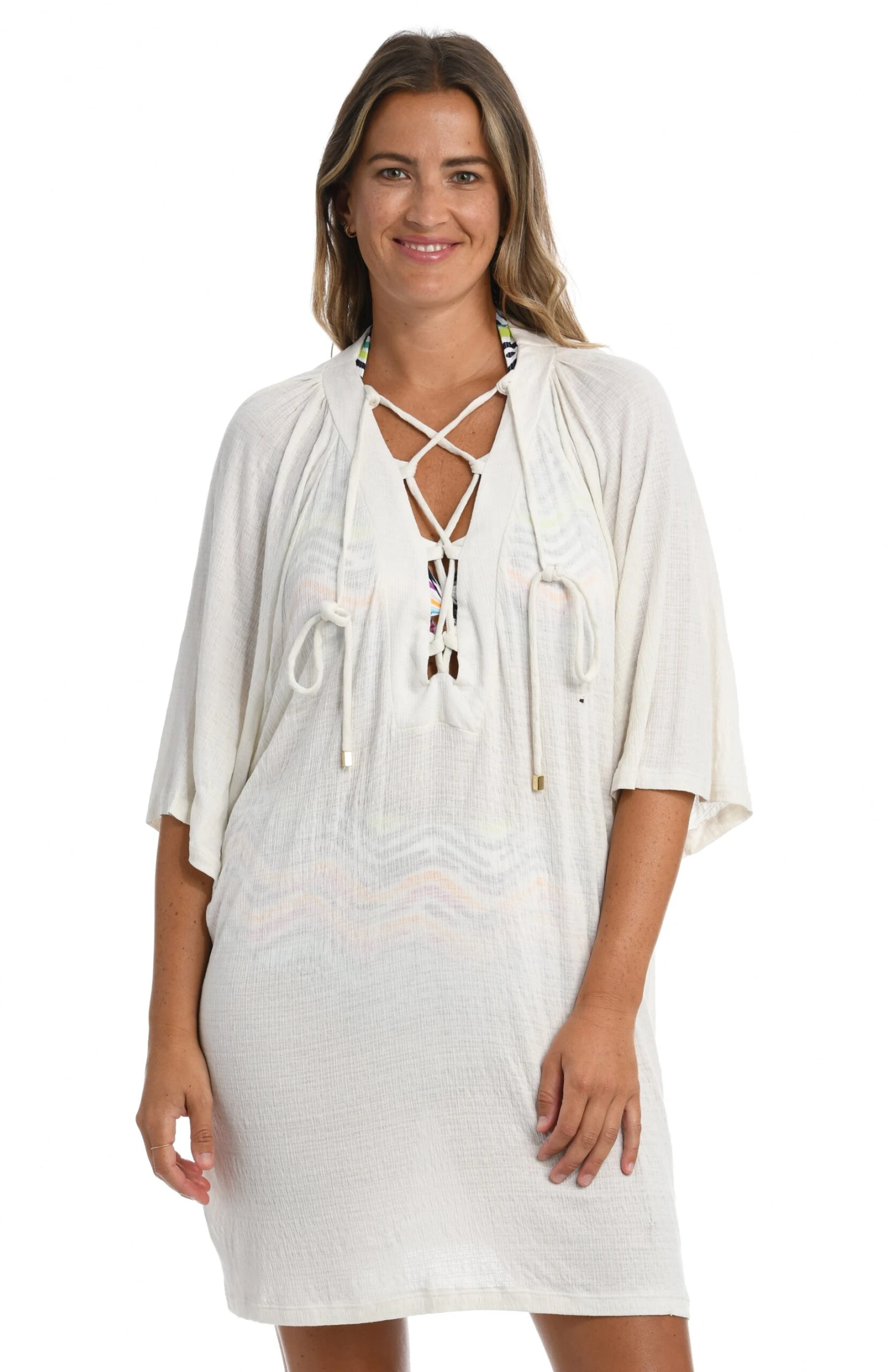 Offering just the right amount of coverage, this resort-ready cover-up is styled with a V-neck lace-up front and elbow-length sleeves cut at angle that provide a light layer of warmth post dip or after the sun sets. The adjustable ties fitted with gold sliders allow you to show as much (or as little) skin as you’d like.