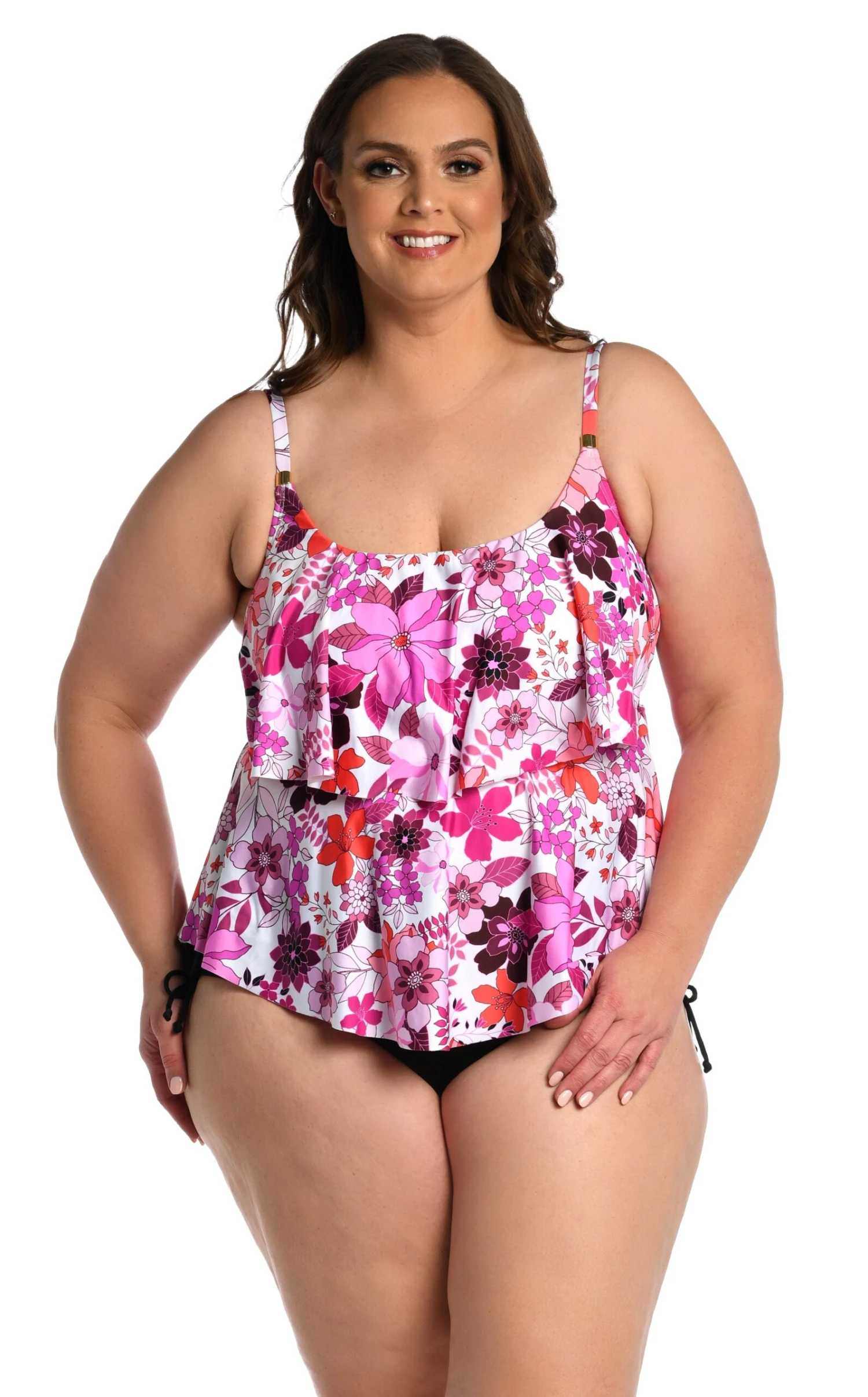 The Tiered Tankini with Gold Slider details in the print Tropic Blooms Multi is perfect for a summer day at the pool if you want to look feminine and cute. With the flowing tiered detail and gold slider on the straps, you can stand out from everyone else.