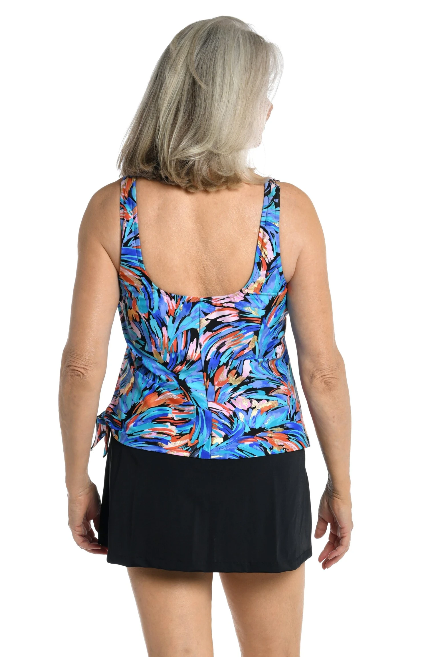 Ruffle some feathers with this swimsuit, rendered in gorgeous shades of blue, pink and coral. A side tie on the one-piece design creates the look of a tankini paired with a skirt. Built-in cups, in addition to tummy toner lift, support and smooth your silhouette.