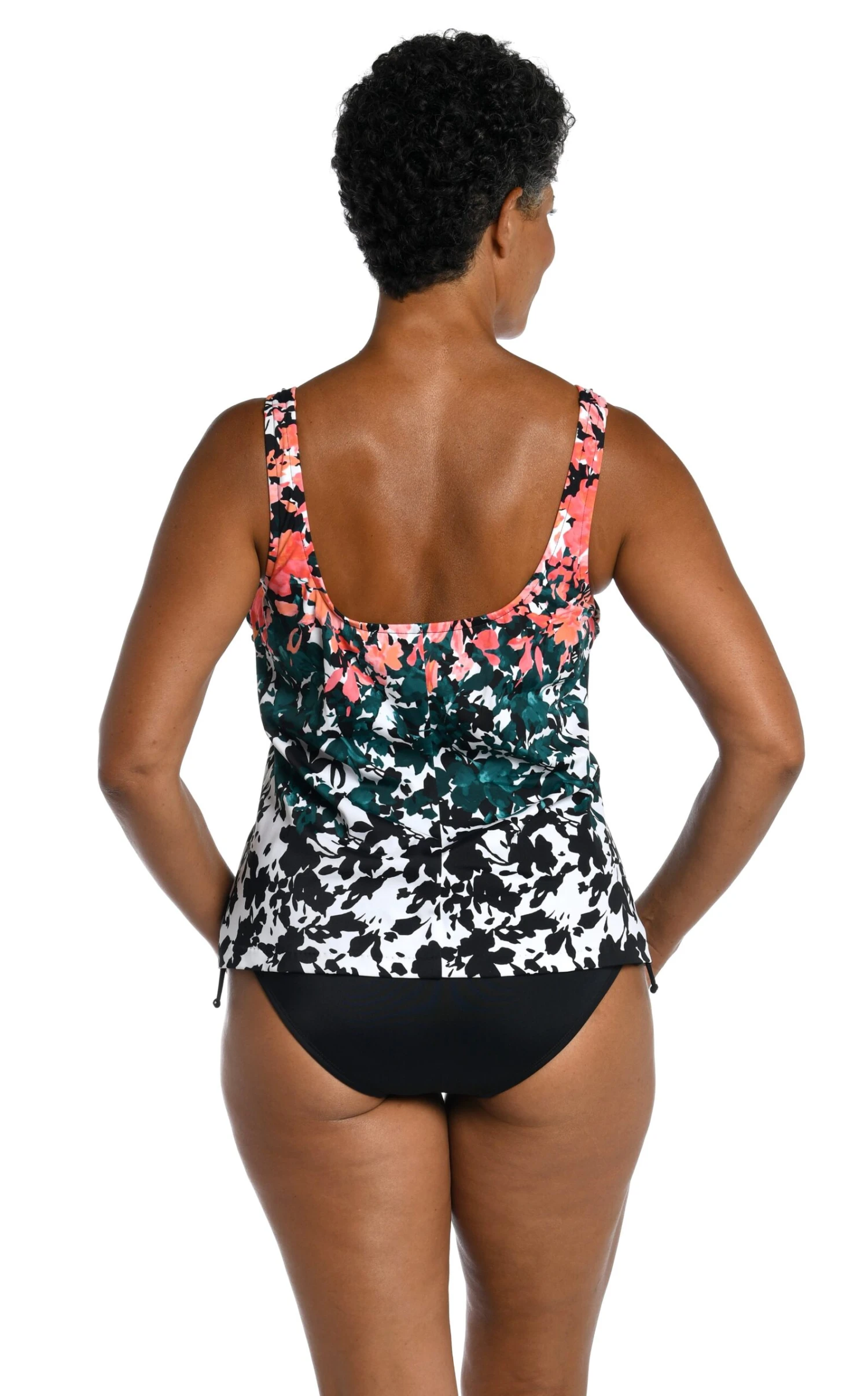 This gorgeous tankini features an intriguing mix of color and pattern with a tossed bouquet of blooms that transitions to black and white with touches of blue. Styled with a flattering scoop neck, this swim top has built-in cups and thick, over-the-shoulder straps that keep you comfortably supported.
