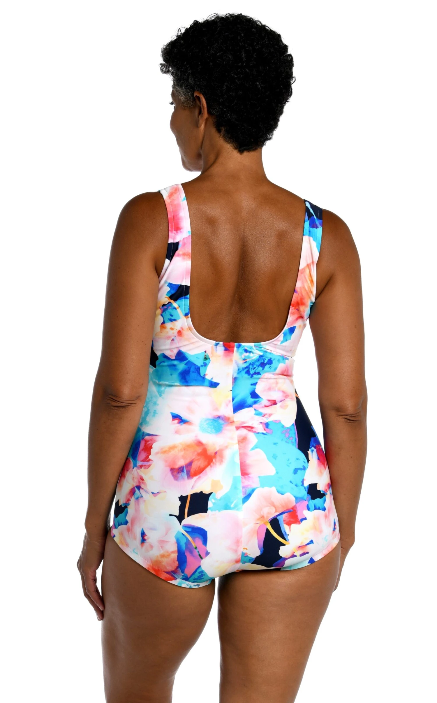 This swimsuit paints a pretty picture in a dreamy watercolor floral print. The sweetheart neckline accentuates the bust by creating the illusion of curves, while center shirring draws the waist for a slimming fit. A girl-leg cut fully covers your hips and rear for instant confidence boosting.