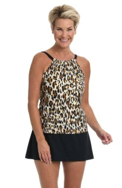 We’re wild about this tankini with an exotic leopard pattern that just can’t be tamed. The high-neck style showcases your shoulders, drawing the eye upward to create a balancing effect. Removable cups with underwires and adjustable straps provide plenty of support.