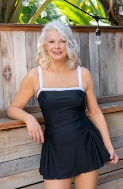 We love the classic look of a solid color swimsuit. It highlights and defines your silhouette in all the right ways. This bandeau swim dress with removable straps is styled with princess seams that skim and slim to give you an hourglass shape. The feminine skirt bottom provides full coverage front and back.