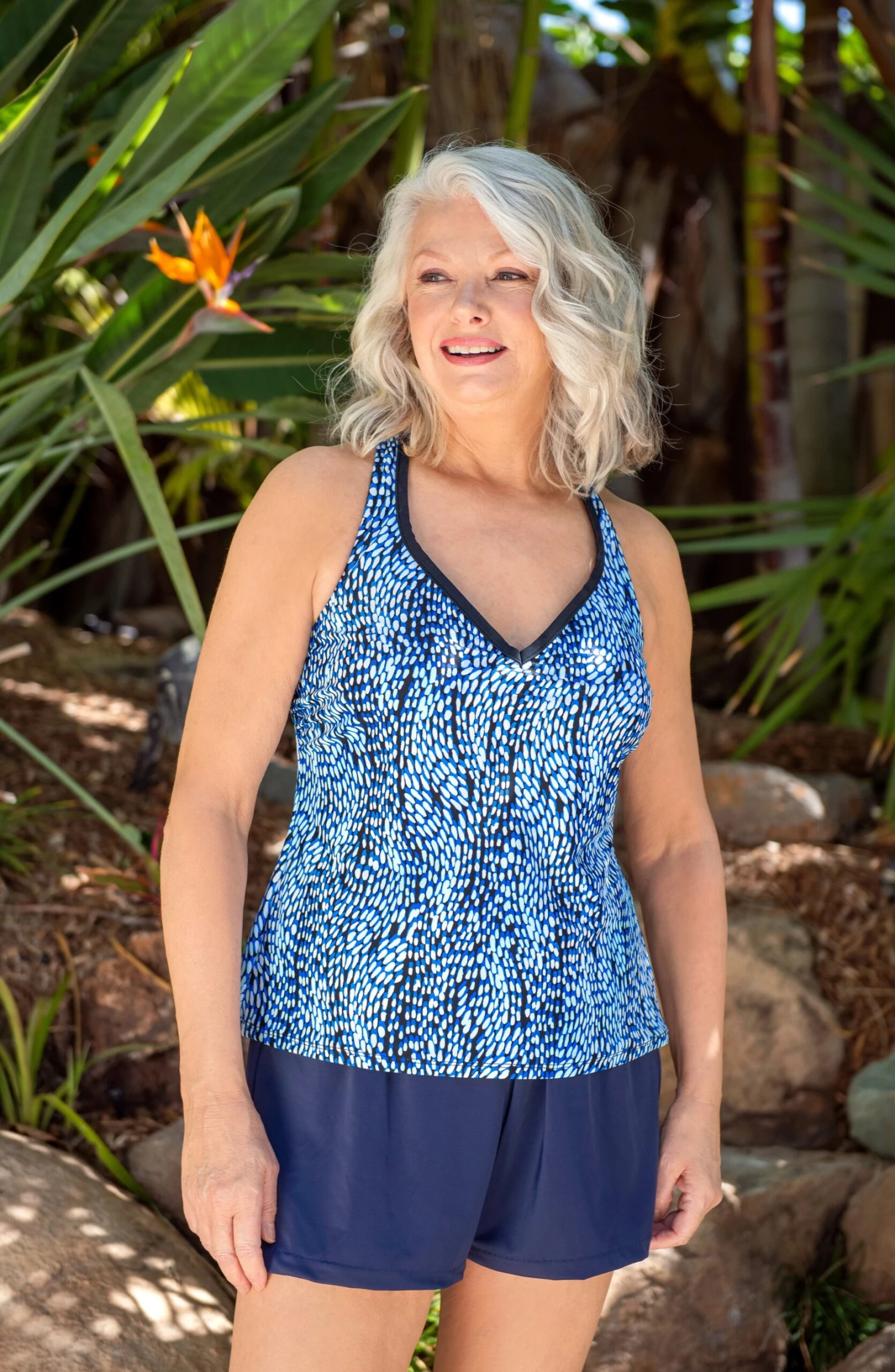 This tankini features gorgeous swirls of blue with pops of white set against a black ground. Built-in cups keep you feeling lifted, while a sporty racer-back design shows off those shoulders.