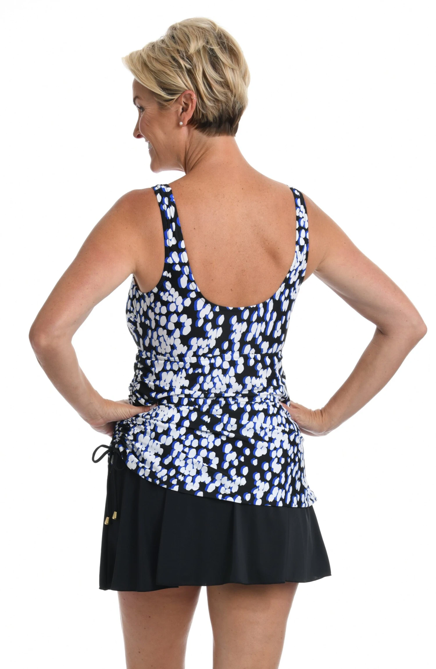 A stylized pattern with blurred edges evokes the gentle rhythm of raindrops on this swim dress. Molded cups and fixed straps provide comfortable support, while a cinch tie at the waist offers an adjustable fit. A built-in tummy toner slims and smooths for a flattering fit.