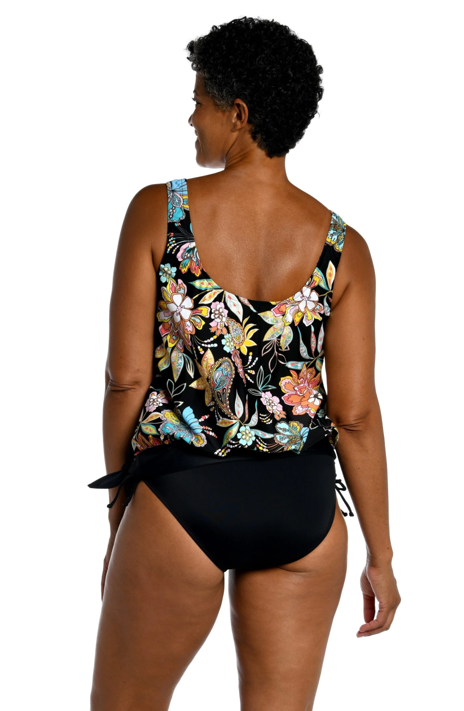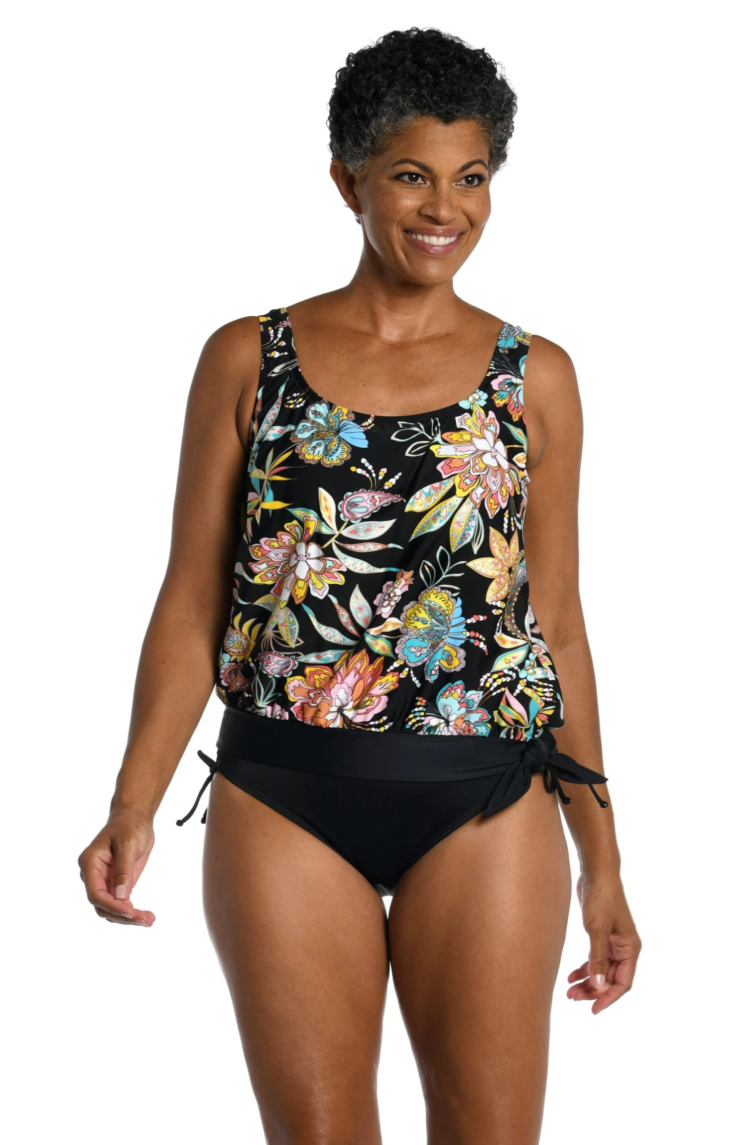 Inspired by the vibrant colors of a coastal town on the Yucatan Peninsula, this tankini features gorgeous blooms in bright, bold hues. The loose-fitting blouson style masks the tummy area, while the side-tie detail adds a flirty touch. Built-in cups and over-the-shoulder straps lift and support the bustline.
