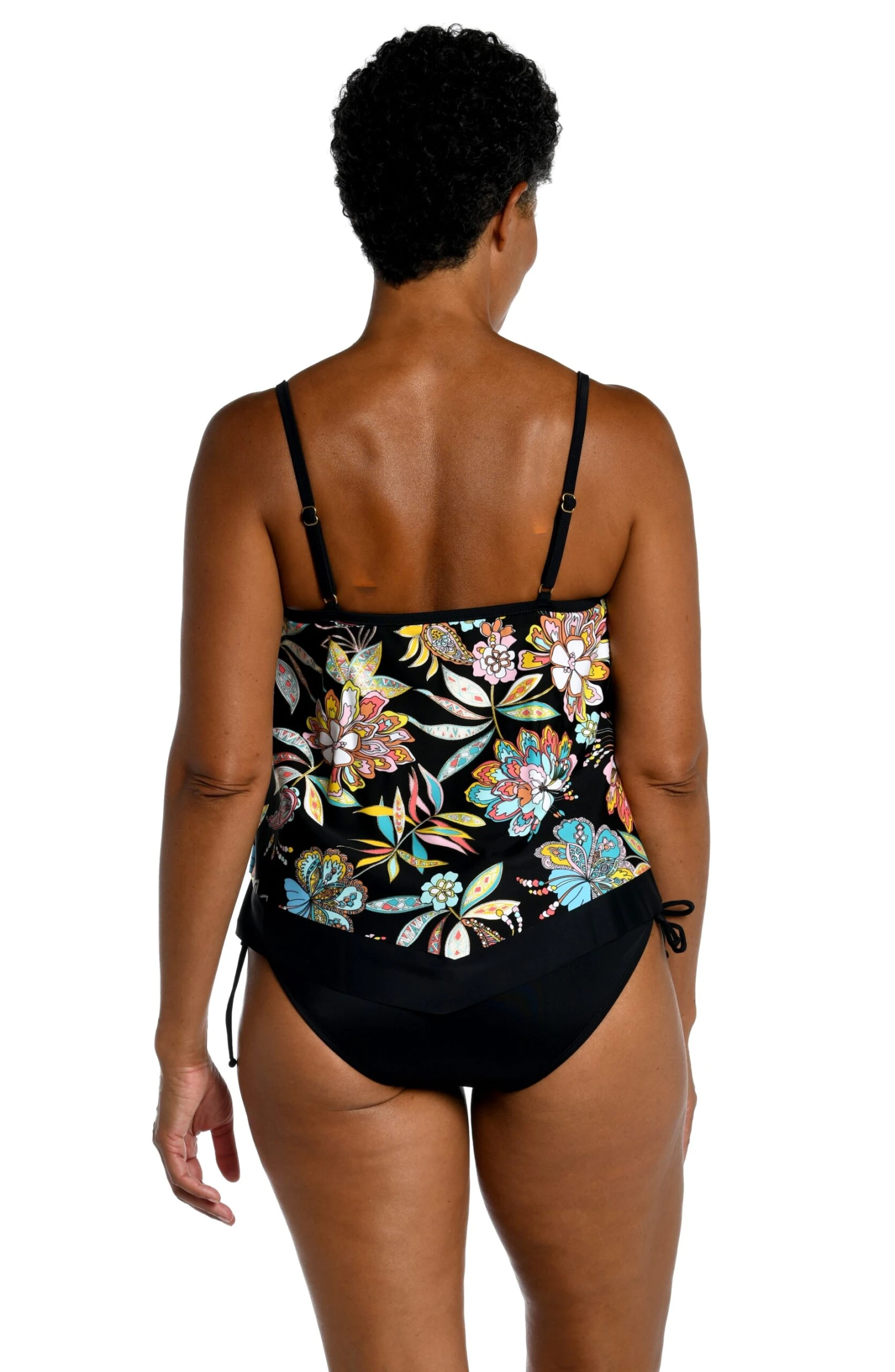 Inspired by the vibrant colors of a coastal town on the Yucatan Peninsula, this tankini features gorgeous blooms in bright, bold hues. Built-in cups and adjustable straps provide comfortable lift and support. A feminine flutter hem allows you to show off your softer side for a confident fit.