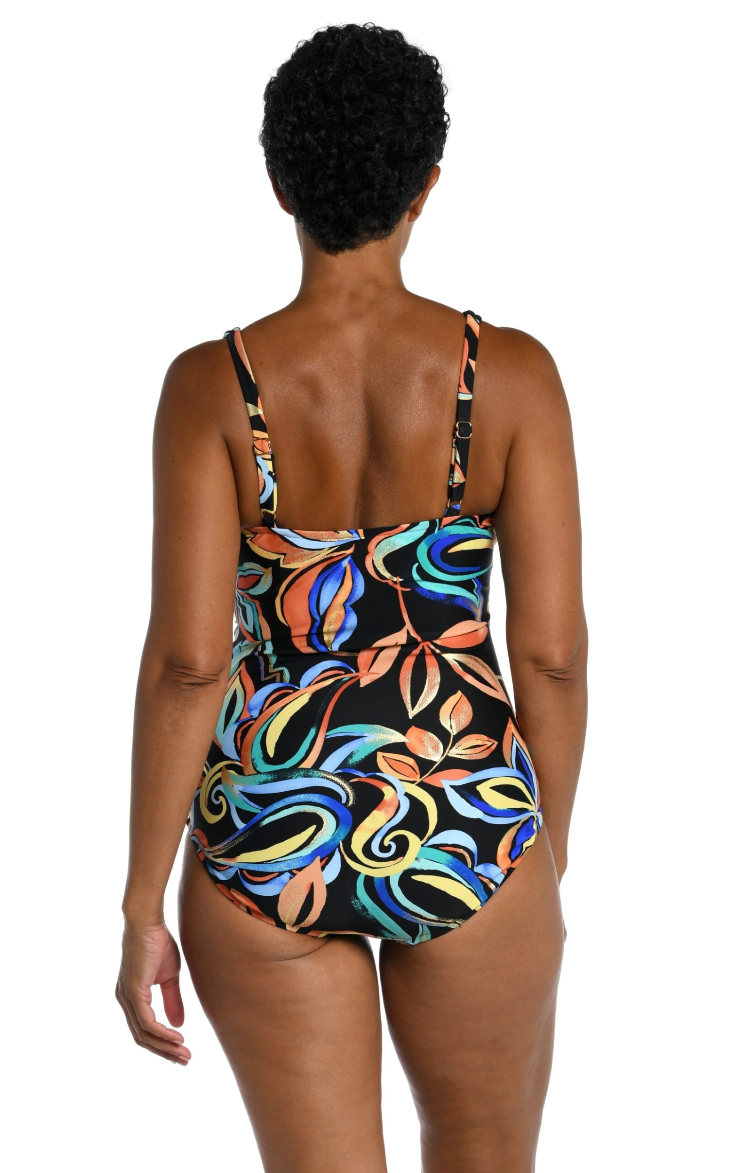 With the look of an artist’s hand, brushstroke shades of yellow, coral and blue create a painterly pattern on this one-piece suit. The twist-front V-neck accentuates the bustline while allover shirring and built-in tummy control neatly conceals worry areas.